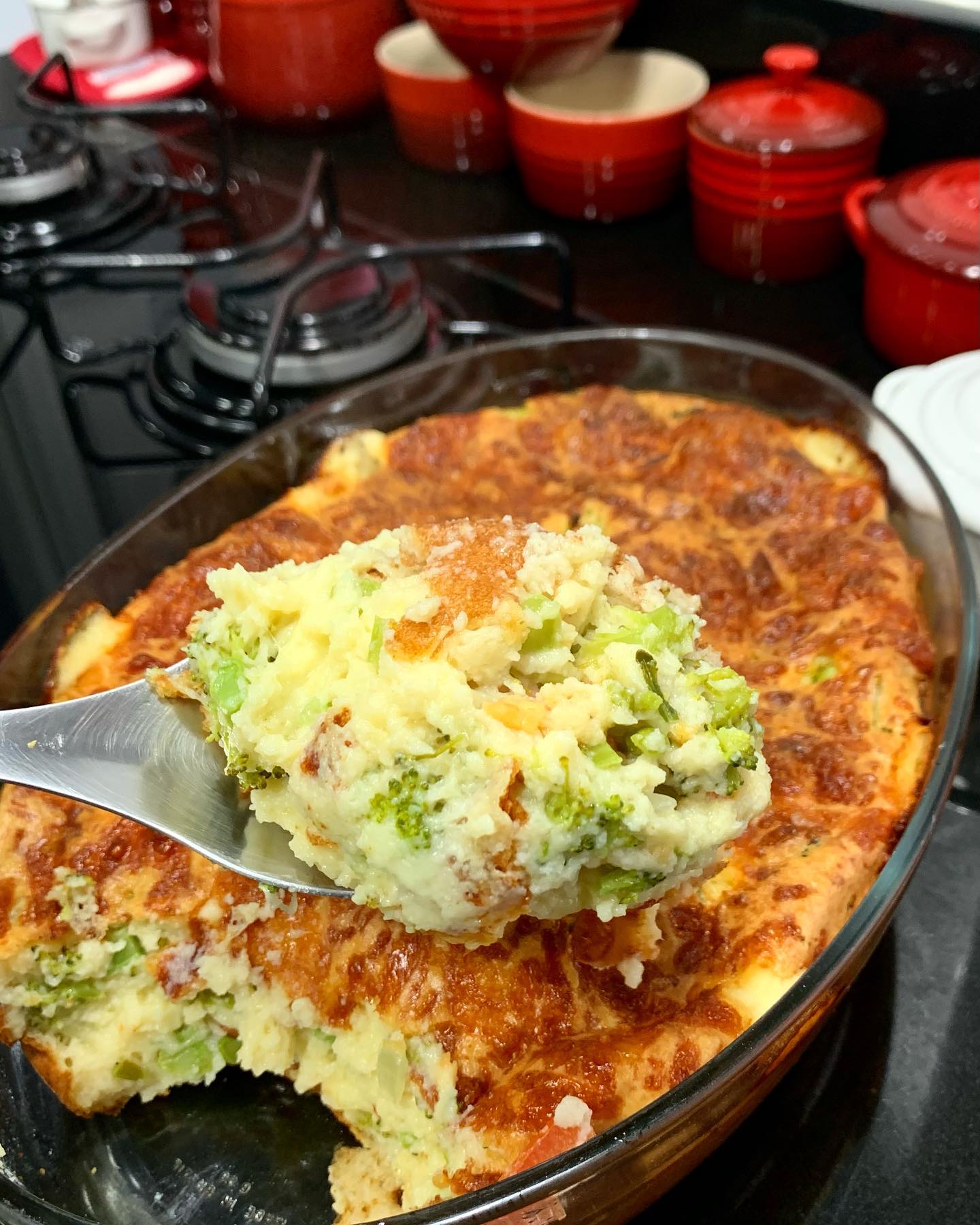 Em um liquidificador, coloque os ovos, o leite, o óleo, a farinha de trigo, o queijo parmesão e o sal e bata até obter uma massa homogênea. Adicione o fermento químico e bata para incorporar. Reserve. Em uma frigideira antiaderente, coloque a cebola e o alho e doure. Acrescente os floretes de brócolis e refogue por 4 minutos. Tempere com sal e pimenta-do-reino. Desligue o fogo, junte o queijo muçarela ralado e o requeijão e misture.